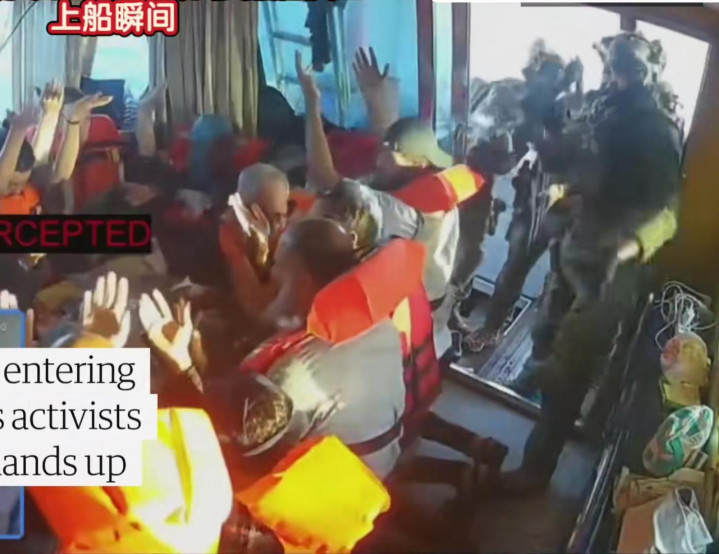 在上面的视频截图中,我们能够看到,当时一艘船上的人员正在坐在驾驶舱里,这个时候门外突然有人敲门,船内的人打开门之后,以色列军人直接闯入,手里拿着枪毫不犹豫的对准众人,要求对方不要做出多余的声响和动作。而船内的人在看到对方持枪而入之后,马上双手举高示意投降。